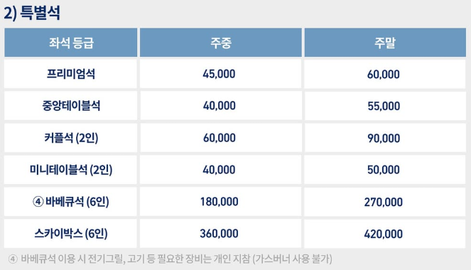 문수야구장의 좌석은 크게 일반석과 특별석으로 나뉘며, 각 좌석은 위치와 편의성에 따라 다양한 가격대로 구성돼 있습니다. 중앙에 가까운 프리미엄석부터 외야 자유석, 바비큐석까지 선택지가 다양합니다.